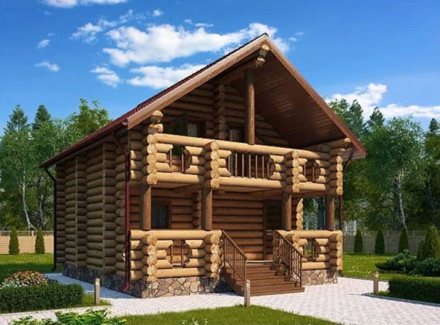 Проект двухэтажного дома из оцилиндрованного бревна с балконом и террасой